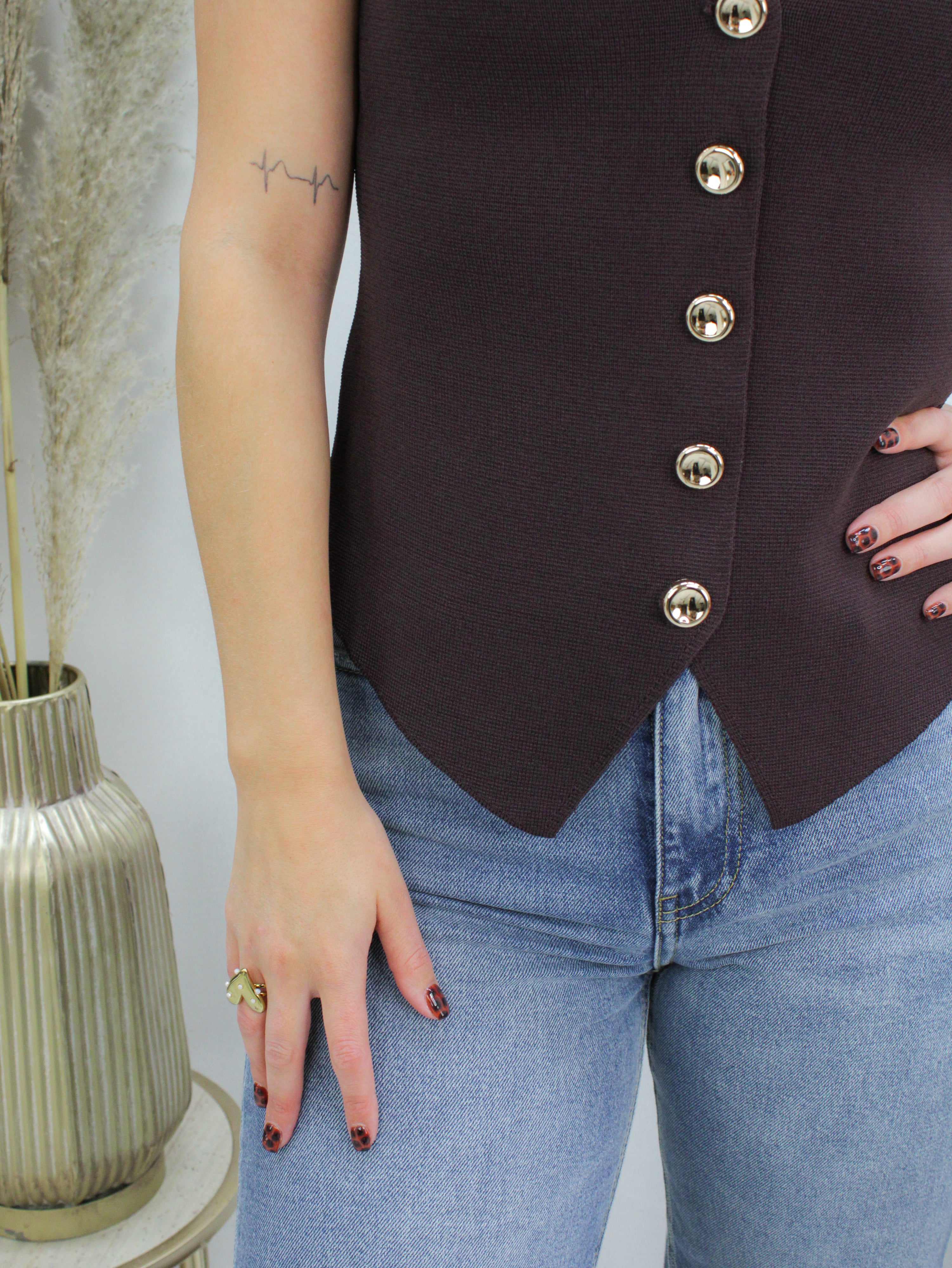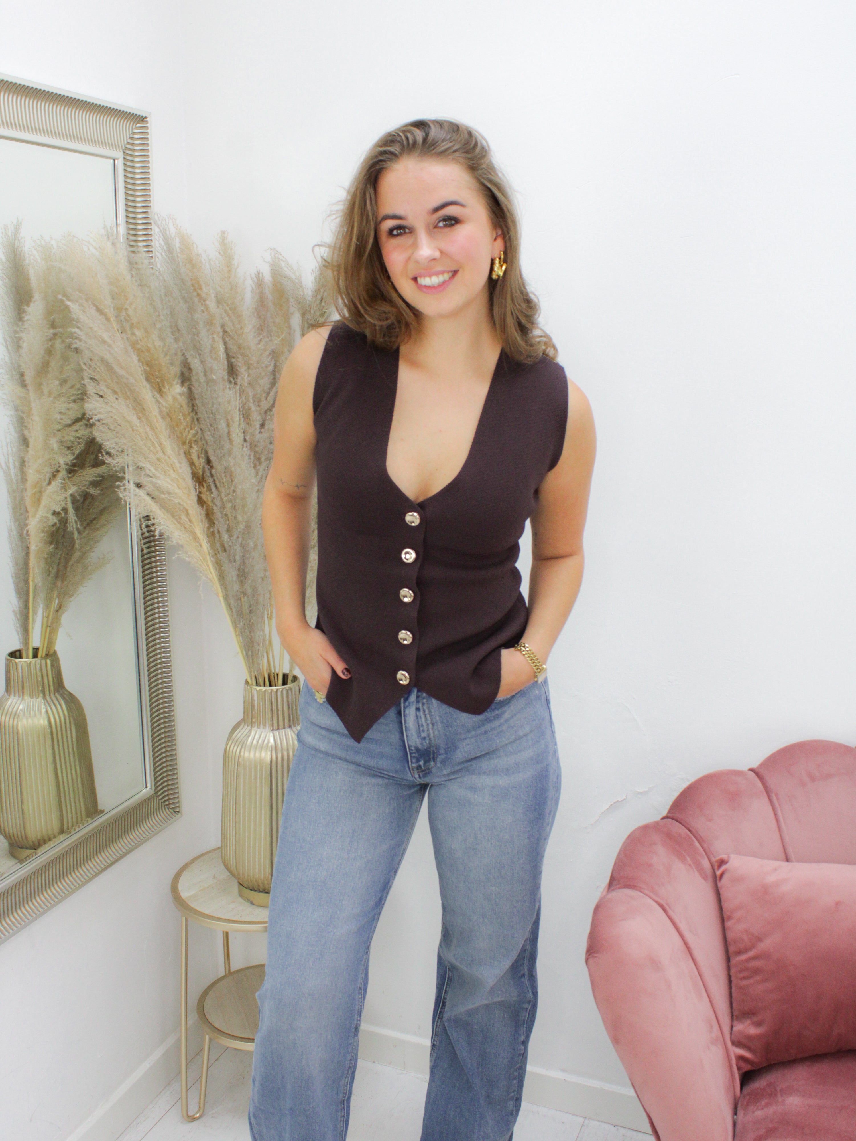 Donkerbruine gilet met gouden knopen. Het model heeft een licht getailleerde pasvorm. Gemaakt van stevige stof die mooi in vorm blijft en geschikt is om zowel los te dragen als over een blouse of top.
