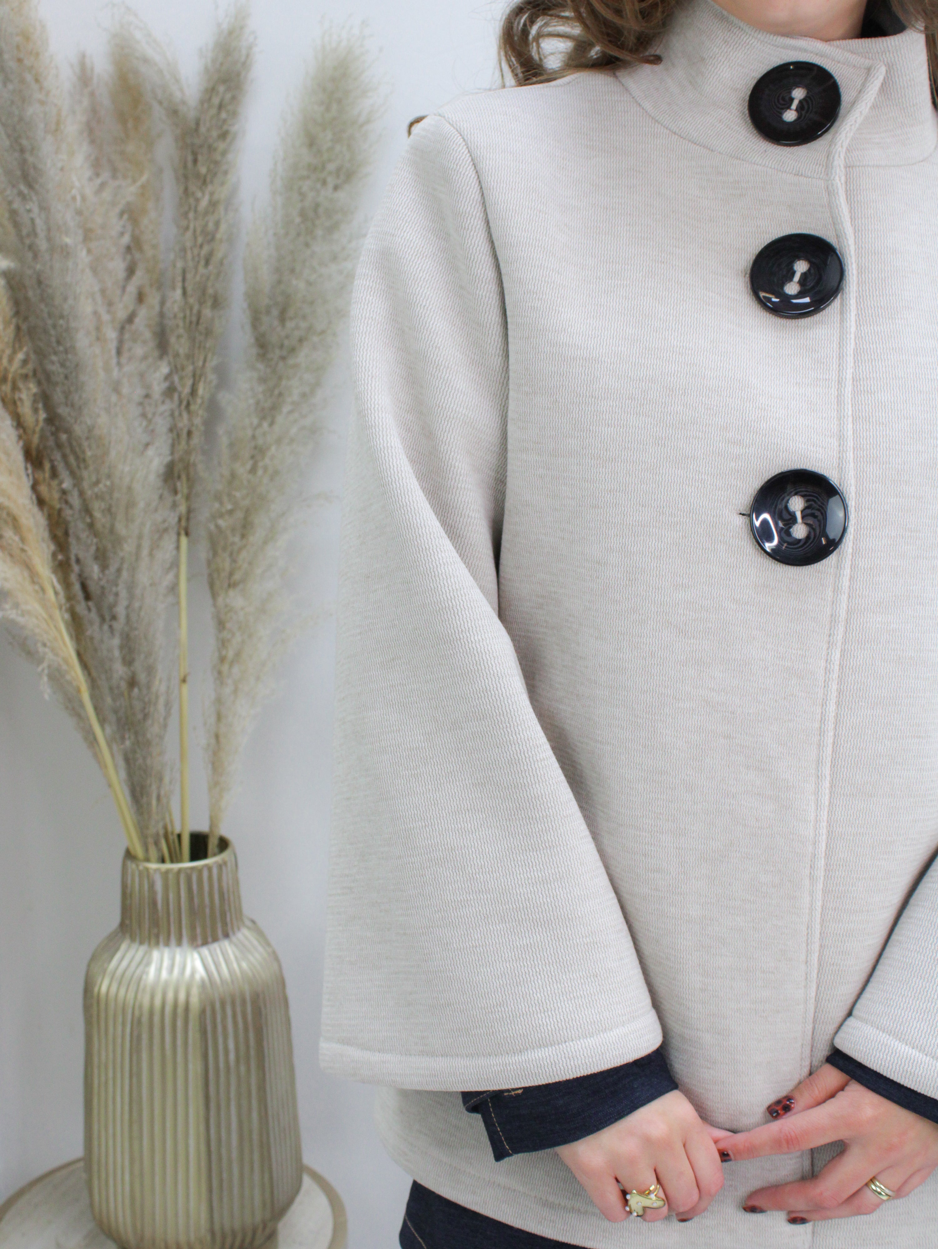 Deze stijlvolle jas in een beige tint is een echte must-have voor het najaar. Het model heeft een losse pasvorm met wijde mouwen en grote, opvallende knopen die zorgen voor een chique uitstraling. Dankzij de hoge kraag en praktische steekzakken combineert de jas elegantie met comfort. Draag hem casual over een jeans of combineer met een jurkje!