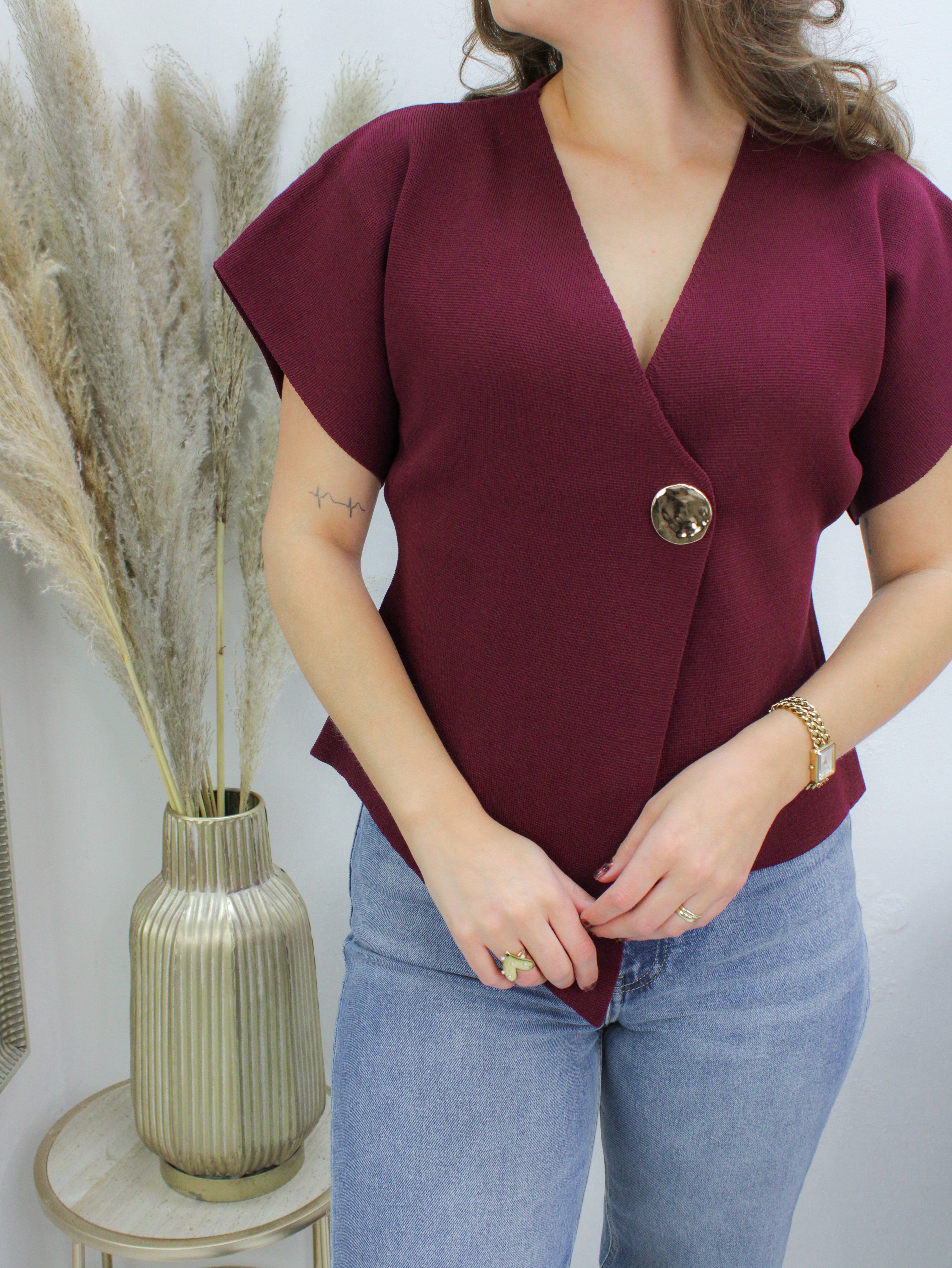 Top in een burgundy kleur met een moderne V-hals. Het model sluit asymmetrisch met een gouden knoop en heeft korte, rechte mouwen. De stevige stof zorgt dat de vorm mooi blijft zitten en geeft de top een clean uitstraling.